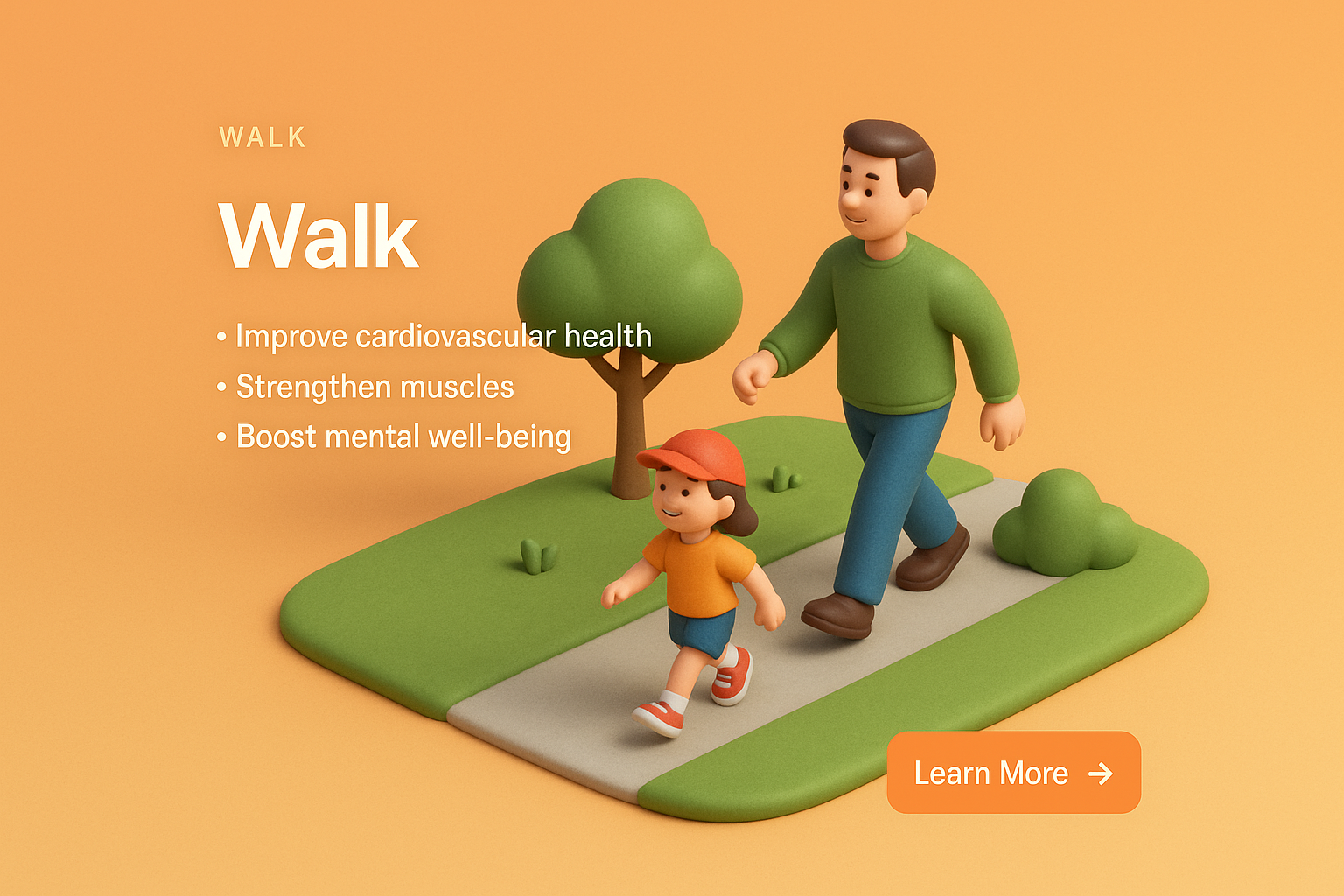 /Collection: /by davooda/Type: PNG/A vibrant 3D illustration depicting two small figures walking on a path, surrounded by minimalistic trees and a gradient background. The scene emphasizes health benefits of walking.