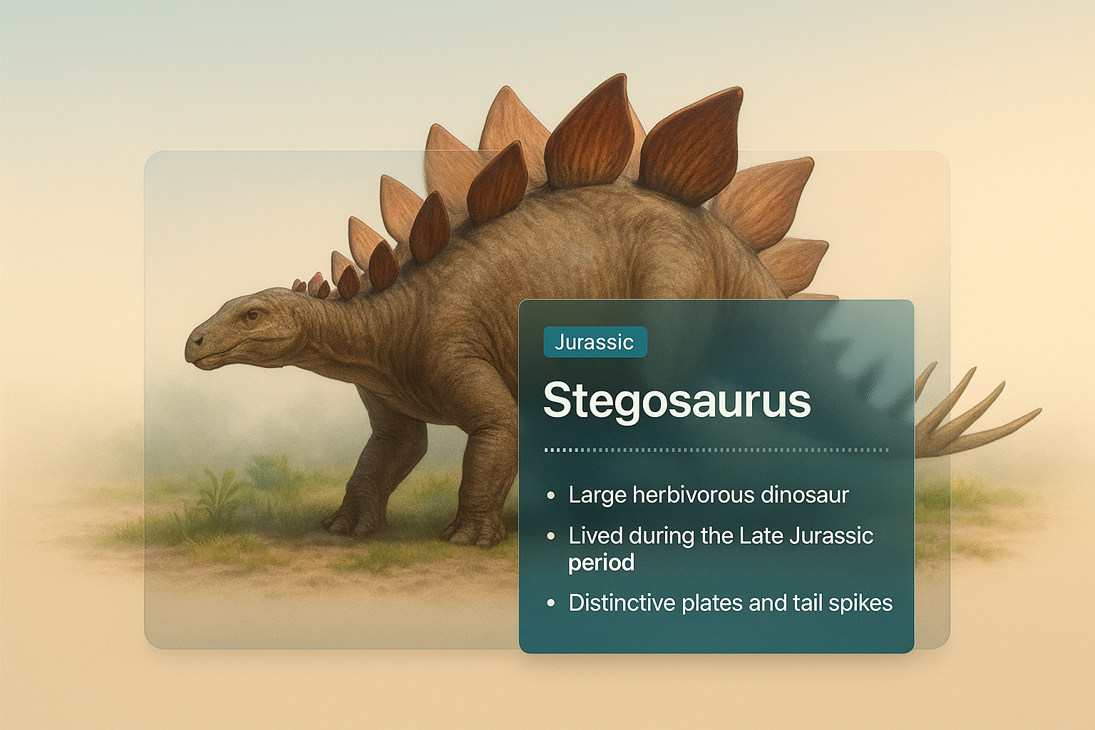 /Collection: /by davooda/Type: PNG/An artistic depiction of a Stegosaurus against a light gradient background. The design includes informative blocks with text and icons, integrating smoothly into the image.
