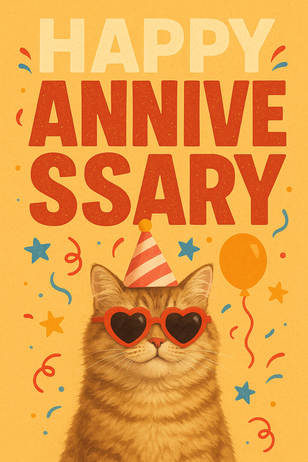 Colorful and playful anniversary card design featuring a cat in sunglasses, party hat, and festive decorations, ideal for celebrating special occasions.