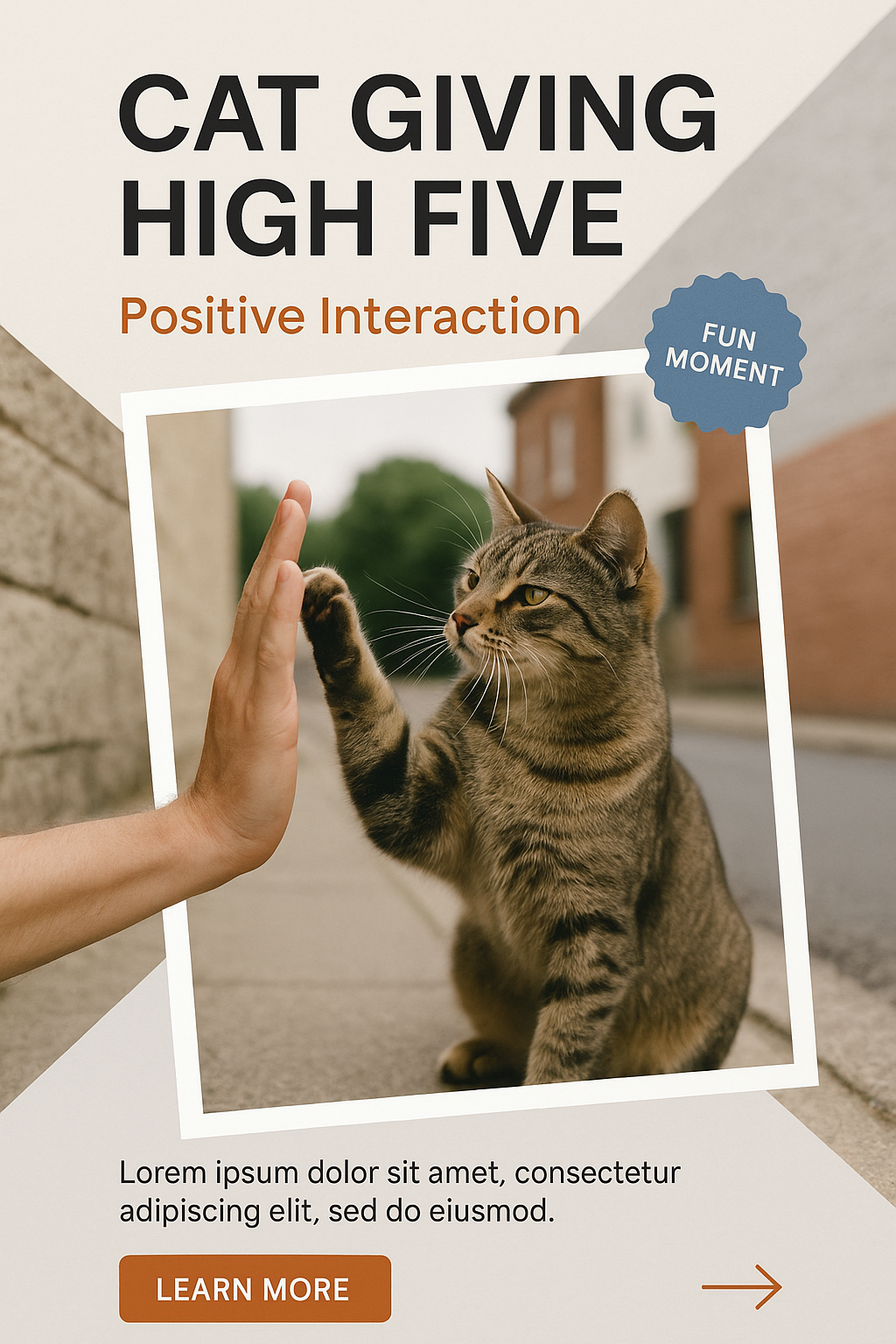 /Collection: /by davooda/Type: PNG/A playful cat giving a high five to a human hand. The image features a structured layout with a fun design element and a clear caption, creating an engaging visual.