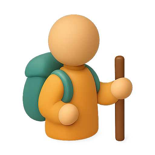 /Collection: /by davooda/Type: PNG/A stylized 3D character illustration of a hiker wearing an orange shirt and a teal backpack, holding a walking stick. Ideal for outdoor adventure themes and travel-related content.