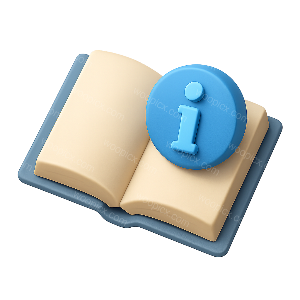 A stylized 3D icon depicting an open book with a blue information circle on top, designed in a three-quarter isometric view with a soft volumetric effect.