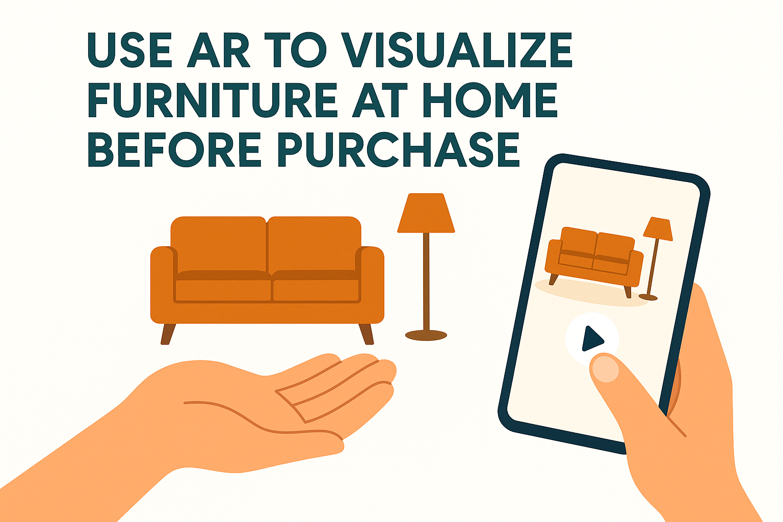 /Collection: /by davooda/Type: PNG/Illustrative graphic showcasing the use of augmented reality to visualize furniture in a home setting before purchase, featuring a hand holding a smartphone with furniture imagery.