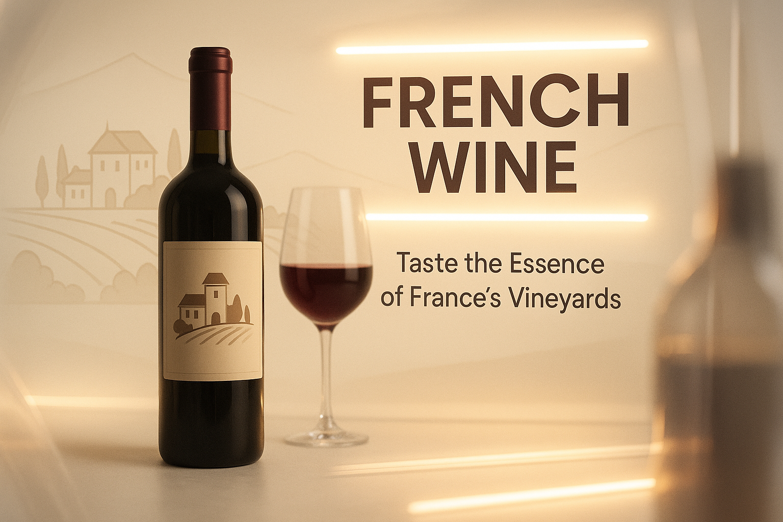 Stylish promotional image showcasing a wine bottle and glass, highlighting the essence of French vineyards. Ideal for wine marketing and branding.