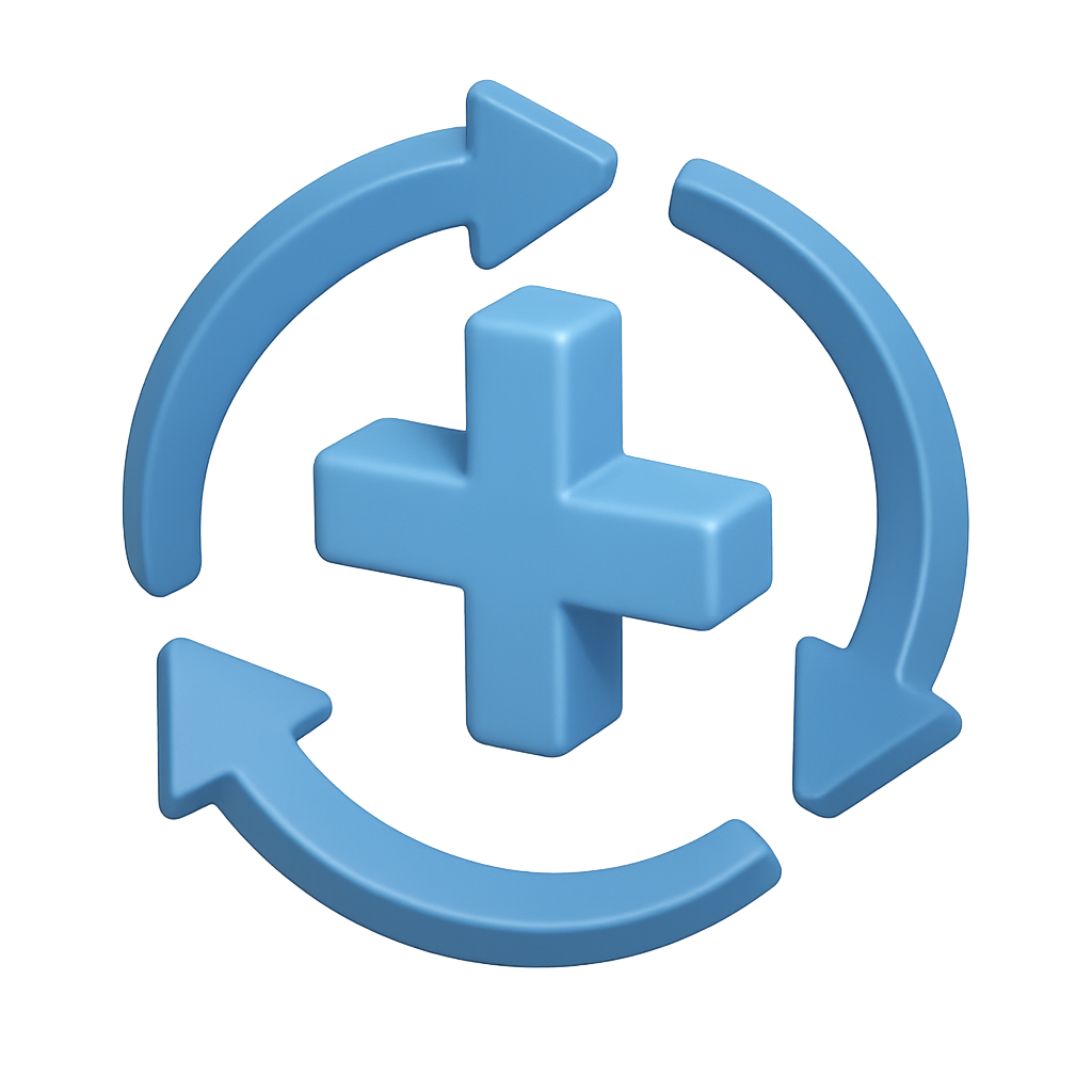 A three-dimensional icon featuring a central plus sign surrounded by rotating arrows, designed with a glossy finish and set against a soft glow, emphasizing depth and movement.