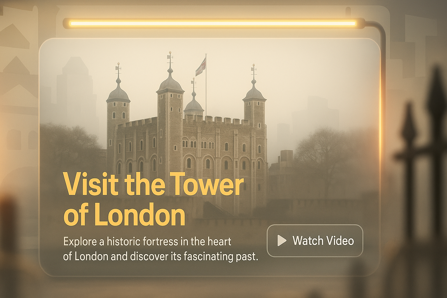 Engaging promotional banner featuring a historic photograph of the Tower of London, designed to encourage viewers to watch an informative video about its history.
