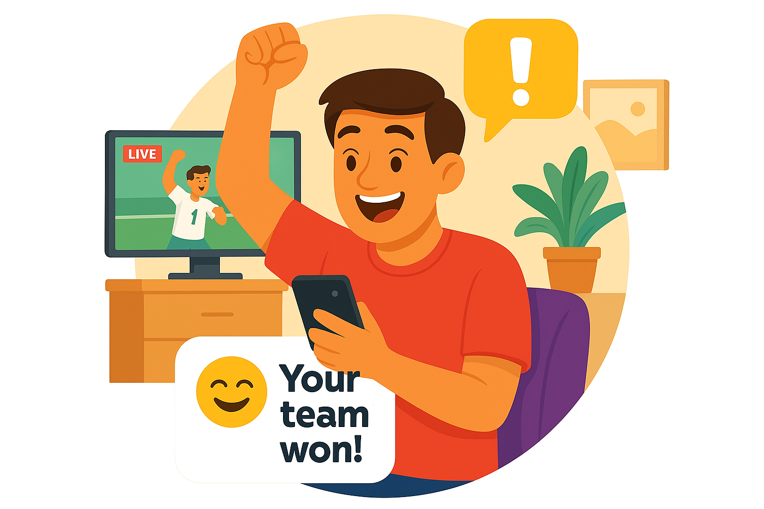 A vibrant illustration of a happy sports fan celebrating a team's victory while using a smartphone, perfect for social media or sports-related content.