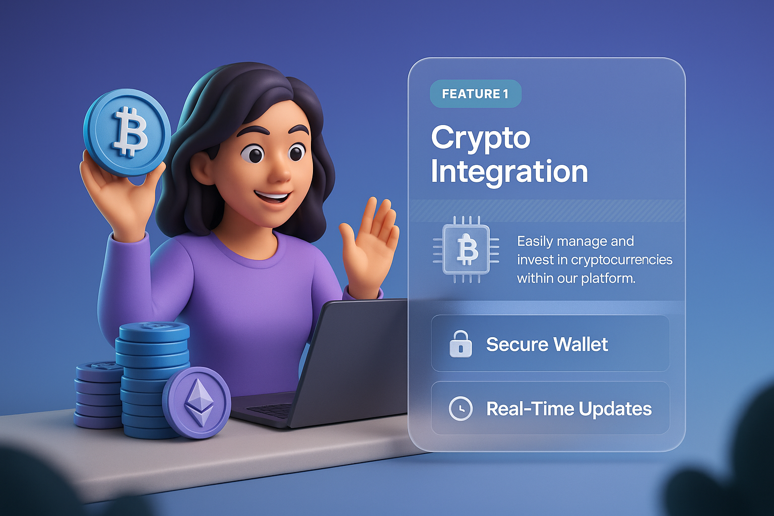 Dynamic 3D Illustration of Crypto Integration with Laptop and Coins
