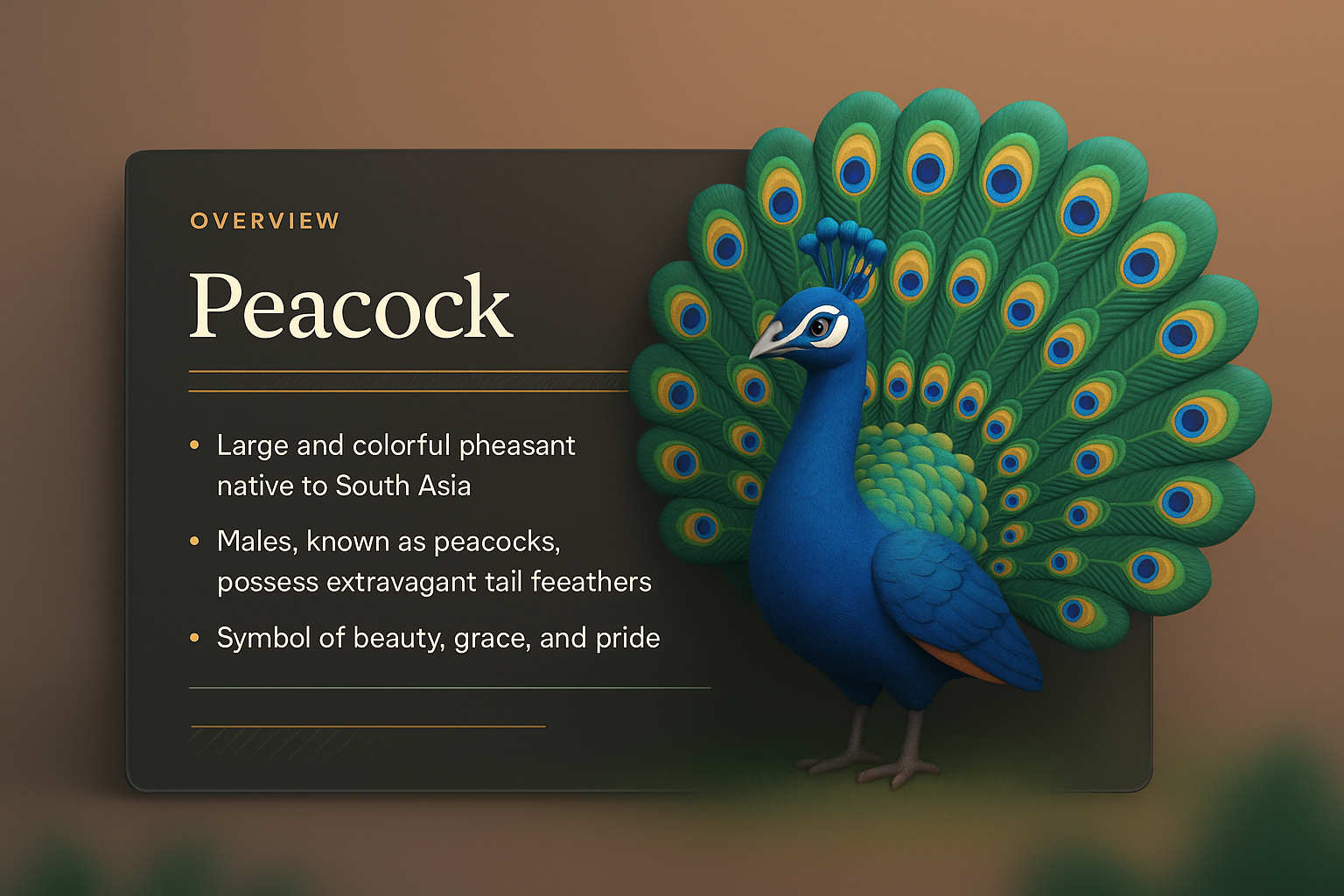 /Collection: /by davooda/Type: PNG/A vibrant 3D illustration of a peacock against a smooth gradient background. The design features integrated information blocks with a dark overlay, highlighting key facts about the peacock.