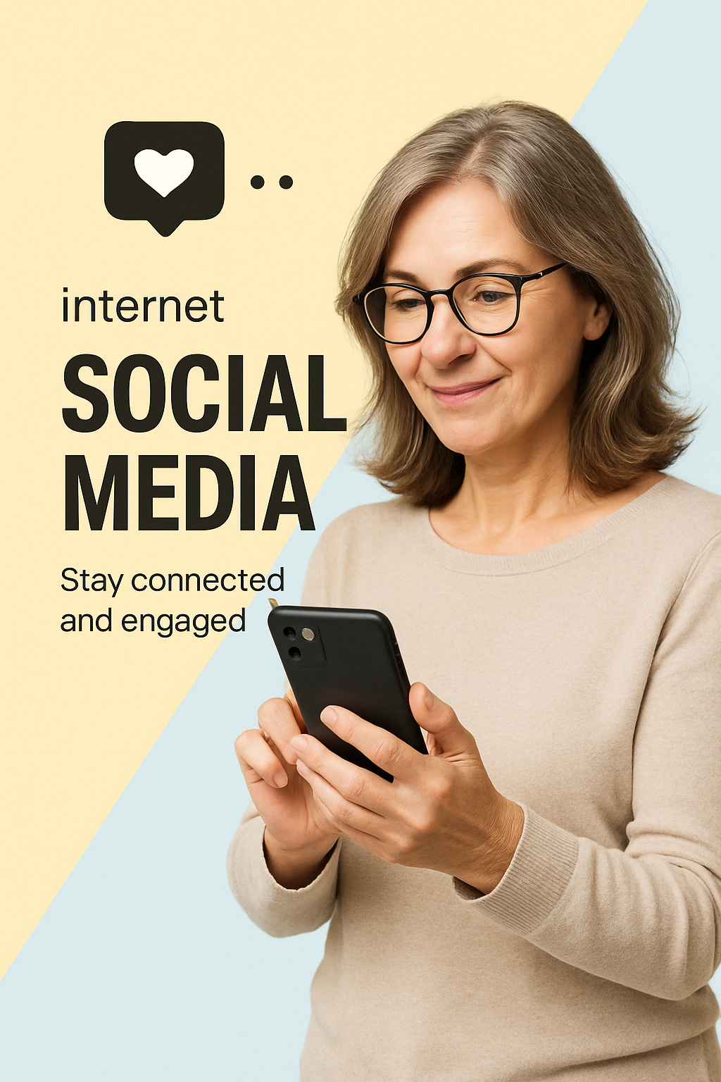 /Collection: /by davooda/Type: PNG/A middle-aged woman is interacting with her smartphone, focused on social media. The background features contrasting light colors, enhancing the modern aesthetic.