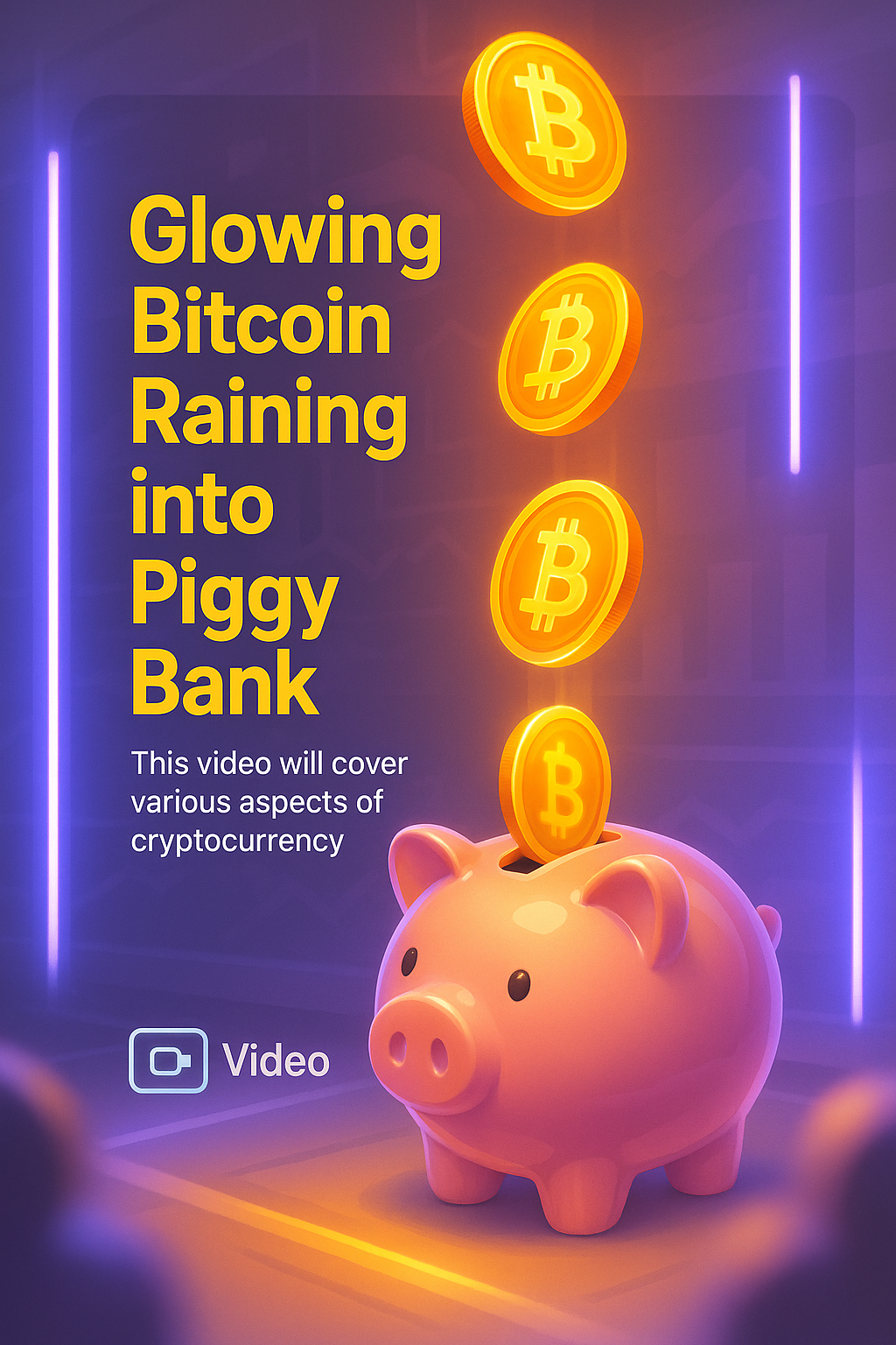/Collection: /by davooda/Type: PNG/Vibrant 3D animation featuring glowing Bitcoin coins falling into a piggy bank, perfect for cryptocurrency-themed video content. Engaging visual style with a modern tech aesthetic.