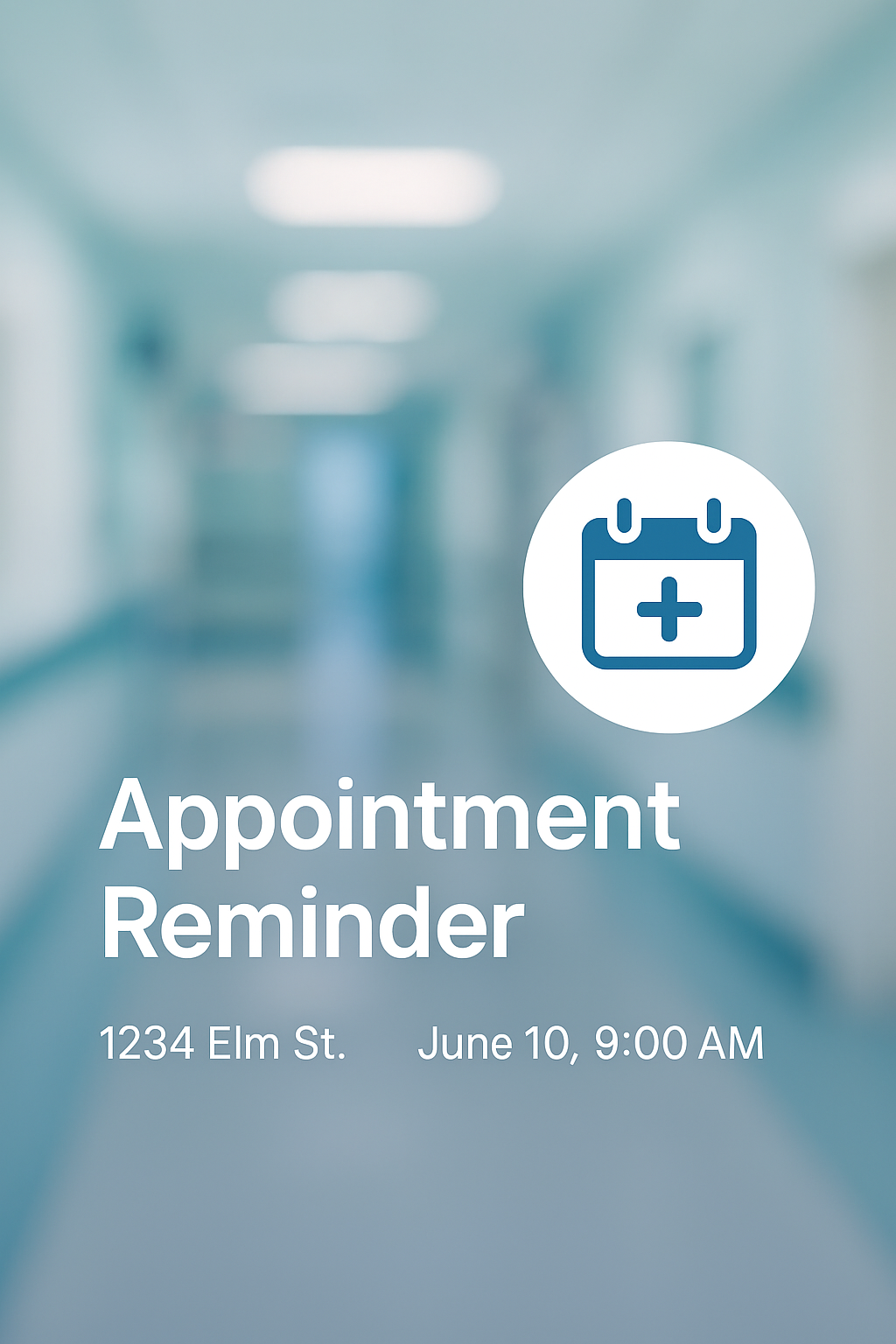 A visually calming appointment reminder graphic featuring a blurred hospital background and clear iconography, ideal for healthcare communication.