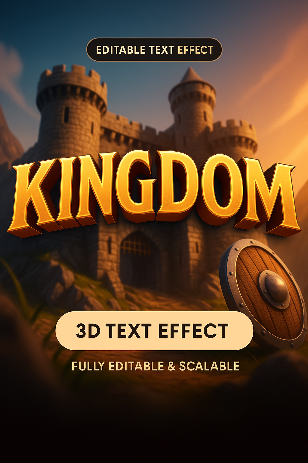 This graphic is a 3D text effect template showcasing the word 'KINGDOM' with a castle background. Ideal for fantasy-themed designs and projects.
