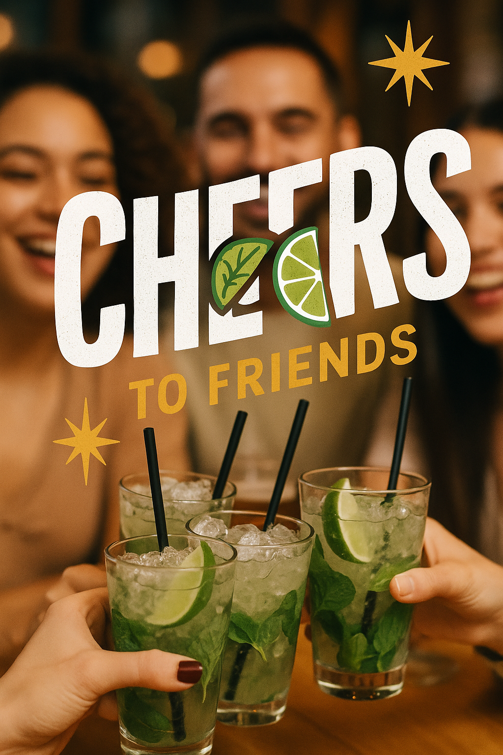 /Collection: /by davooda/Type: PNG/Vibrant social media post featuring friends toasting with drinks, embodying a festive and joyful atmosphere, ideal for promoting social events or gatherings.