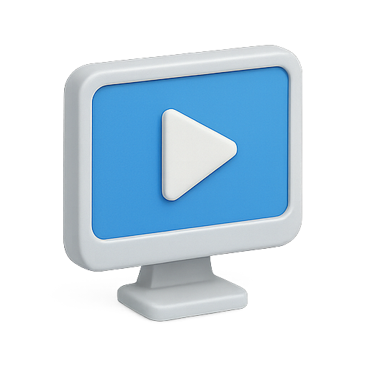 A modern and minimalistic icon featuring a play button on a desktop monitor, suitable for digital media applications, streaming services, or video content.