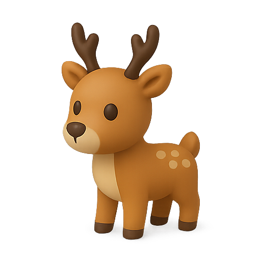 Adorable 3D cartoon deer character with rounded features and soft colors, ideal for children's illustrations, animations, or playful branding.