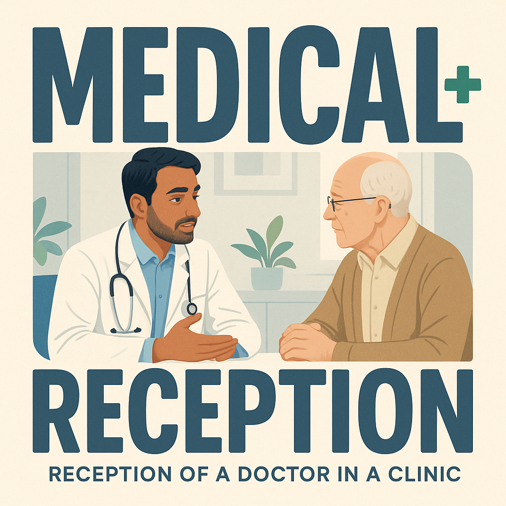 /Collection: /by davooda/Type: PNG/A visually engaging illustration depicting a medical reception scenario, featuring a doctor interacting with an elderly patient. The design is friendly and approachable, ideal for healthcare-related content.