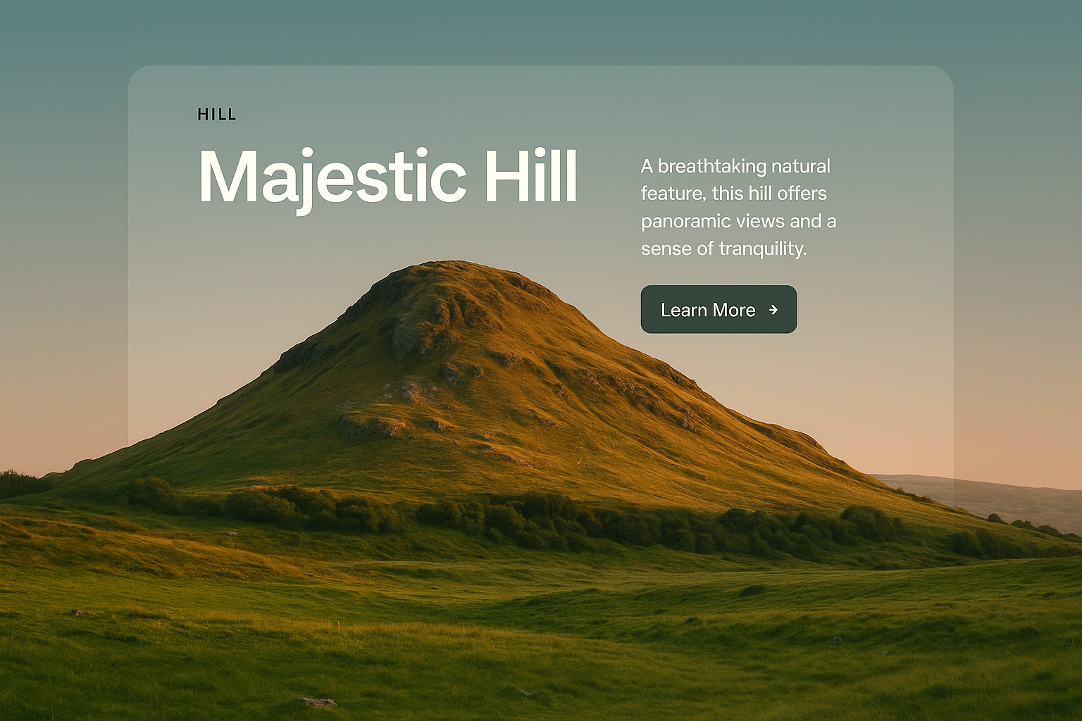 A stylish web page layout showcasing 'Majestic Hill' with a gradient background, a short title, a descriptive text block, and a clear call-to-action button.