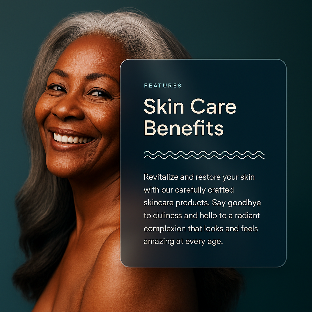 /Collection: /by davooda/Type: PNG/A beautiful black woman with smooth skin and long gray hair smiles happily. The image promotes skincare benefits, showcasing elegance and confidence in aging gracefully.