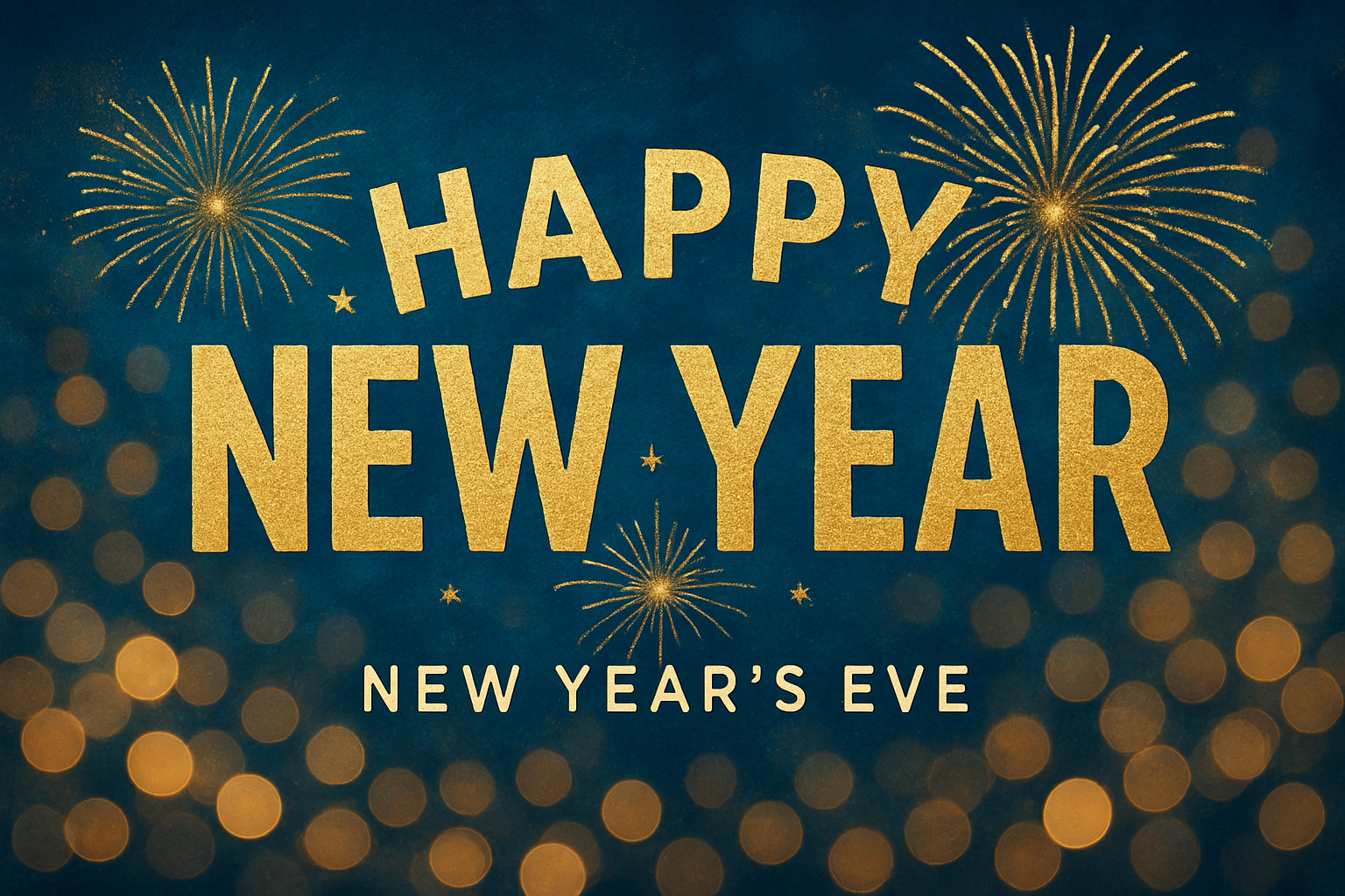 Vibrant New Year's Eve graphic featuring bold golden typography and festive fireworks, ideal for social media posts or event promotions.