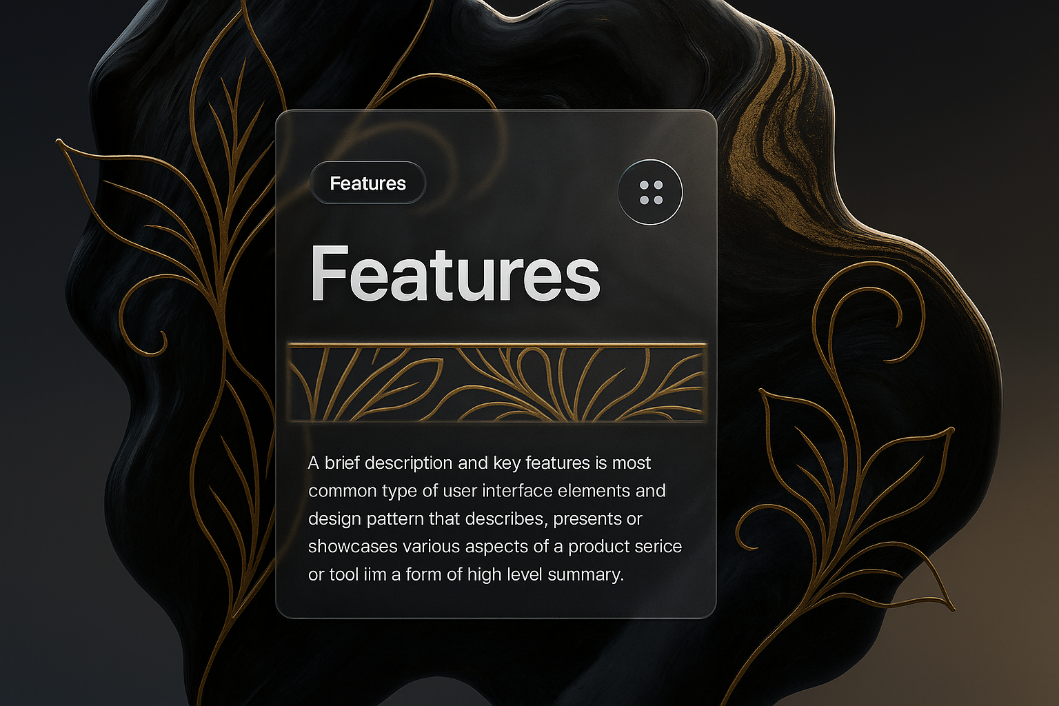 /Collection: /by davooda/Type: PNG/An abstract black, gold, and white floral pattern serves as a stylish background. A transparent features block overlays, showcasing text and design elements.