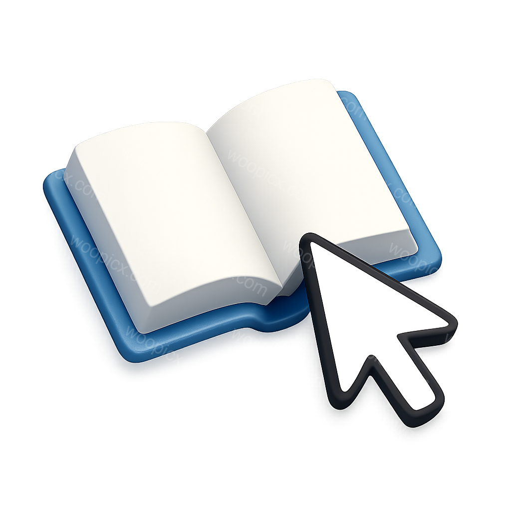 A visually appealing 3D icon depicting an open book alongside a cursor, designed with a transparent background. The isometric view enhances its volumetric feel.