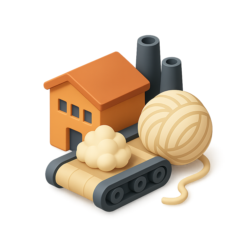 /Free/Collection: /by davooda/Type: PNG/A vibrant 3D icon featuring a factory with smokestacks and a large yarn ball on a conveyor belt. The factory is orange with a simple design, adding a playful element.