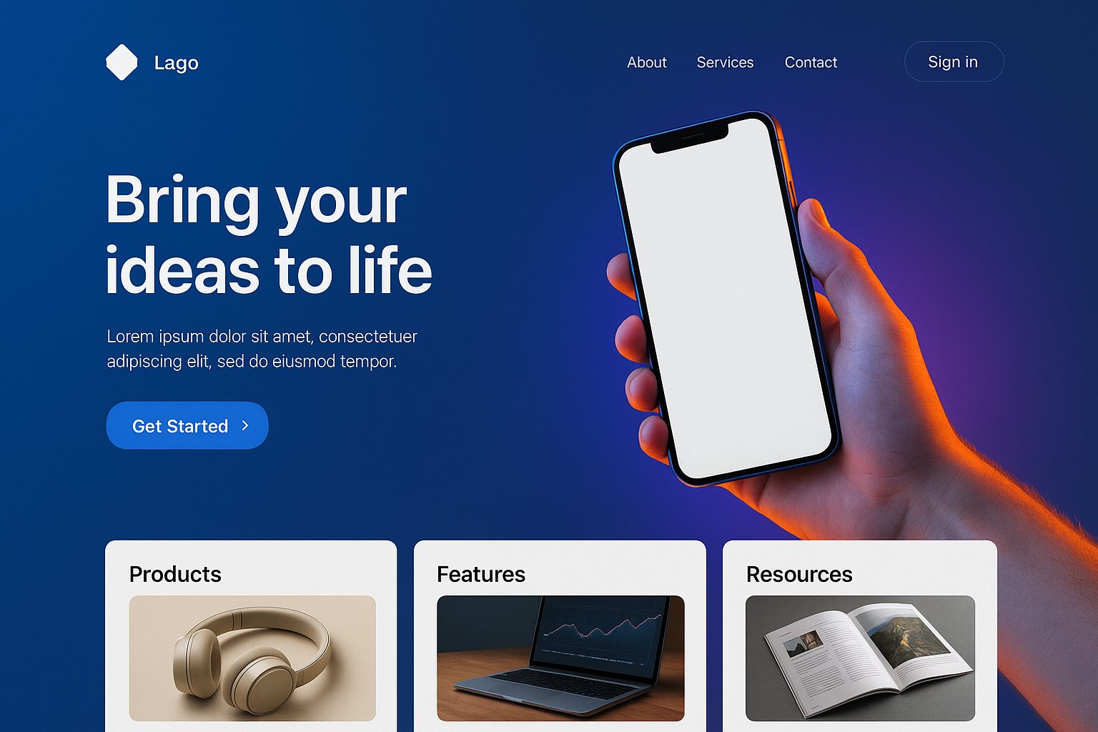/Collection: /by davooda/Type: PNG/A visually engaging landing page featuring a blue background, a hand holding a tilted smartphone with a white screen, and sections for products, features, and resources.