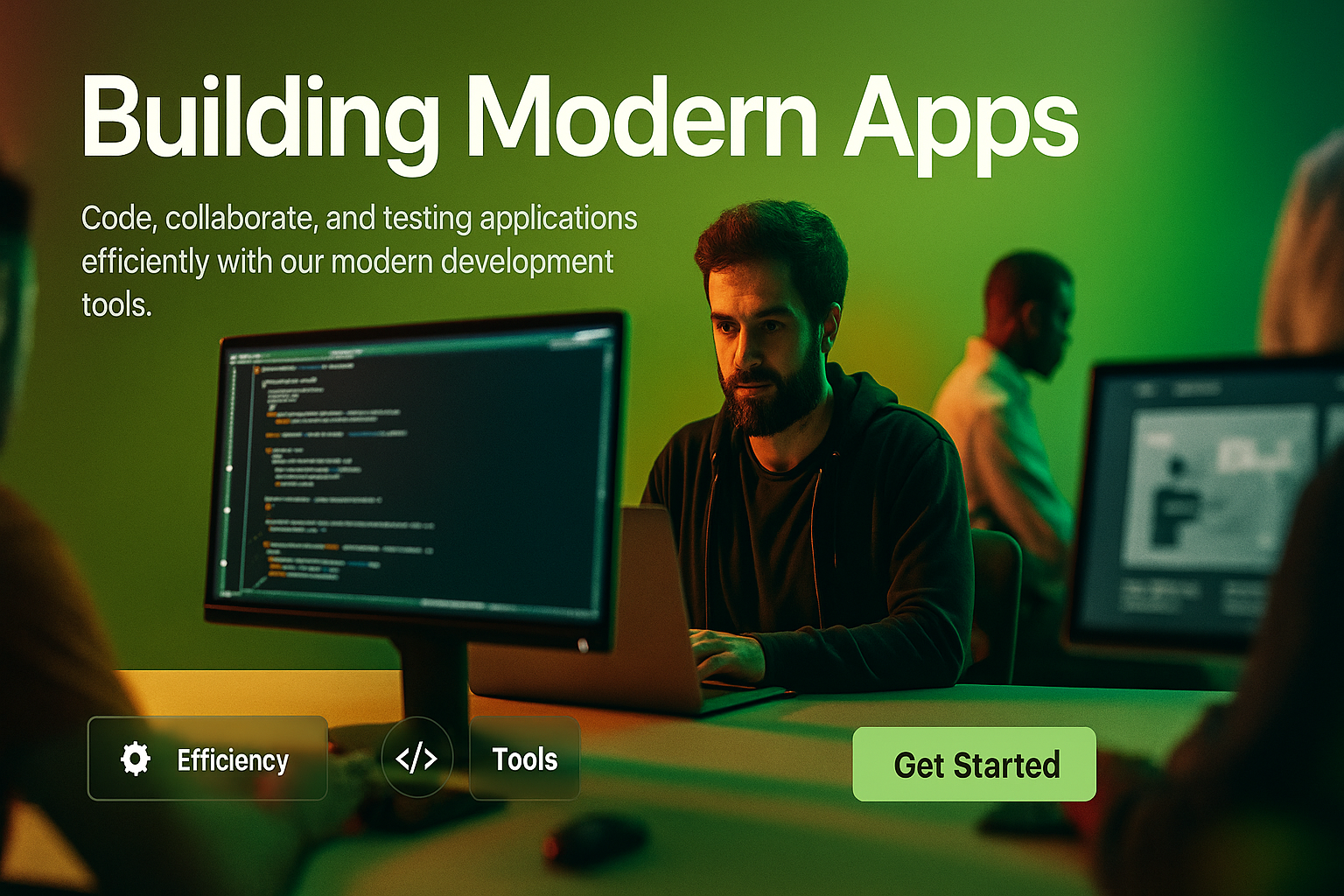 /Collection: /by davooda/Type: PNG/A vibrant scene depicting software developers engaged in coding and collaboration, set against a sleek backdrop. The image highlights the focus on modern tools and coding efficiency.