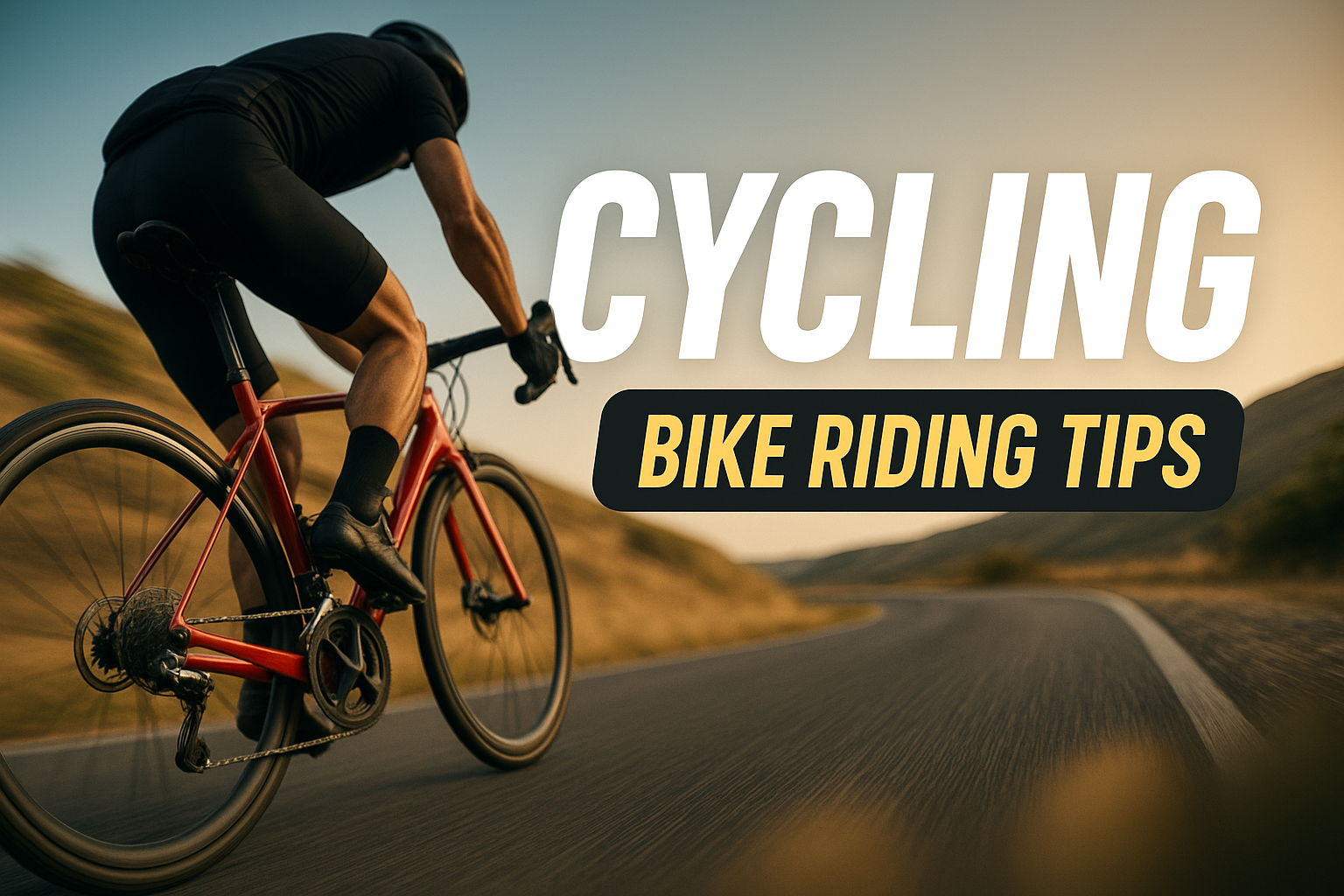 Vibrant cycling image featuring a rider in motion, complemented by bold text offering bike riding tips. Ideal for fitness blogs or cycling-related content.