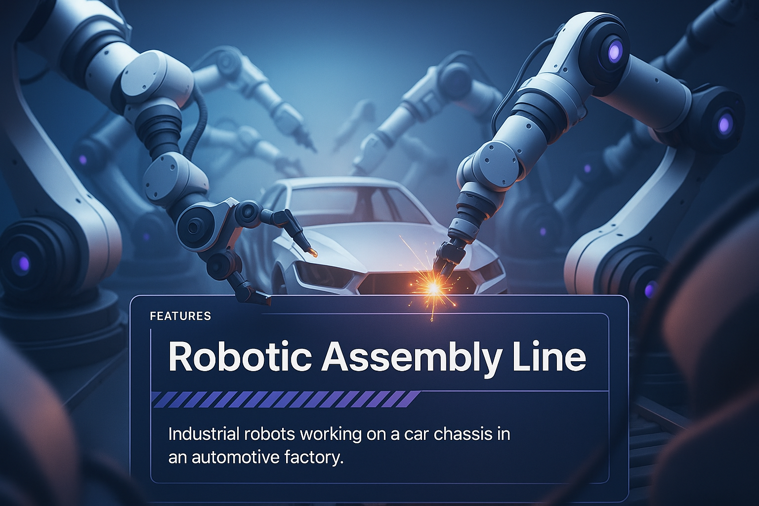 /Collection: /by davooda/Type: PNG/A vibrant 3D illustration showcasing robotic arms working on a car chassis in an automotive factory. The design features a gradient background and dynamic composition.