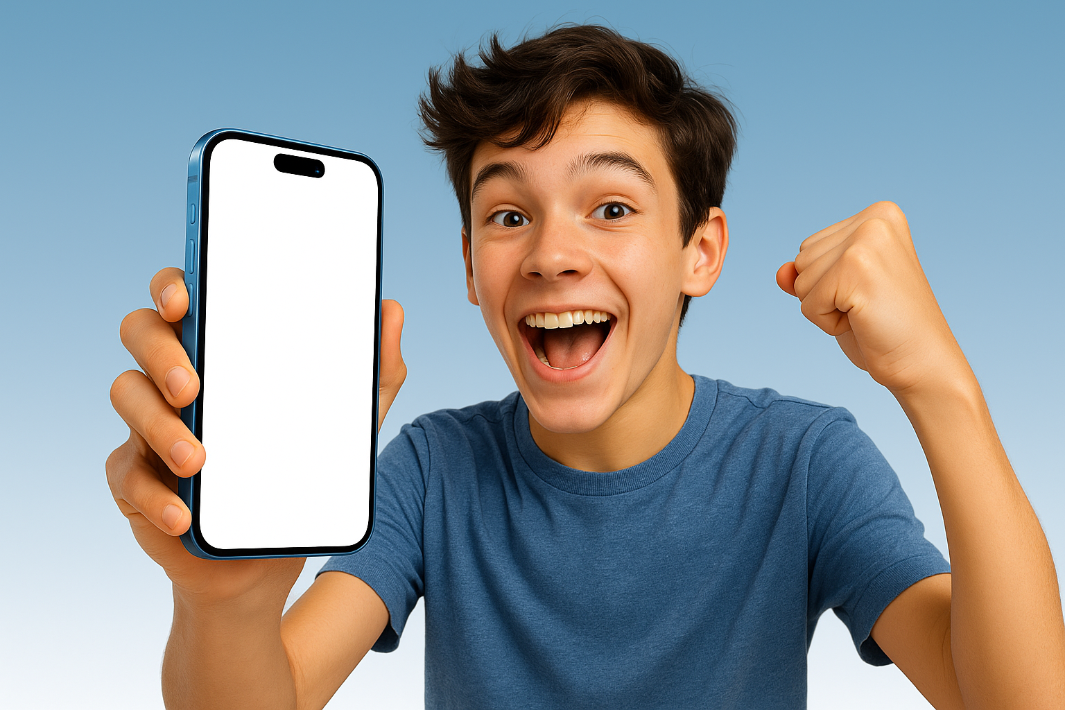 A young teenager joyfully holds a blue smartphone with a blank screen, showcasing a dynamic pose. The background features a gradient that enhances the lively expression of excitement.