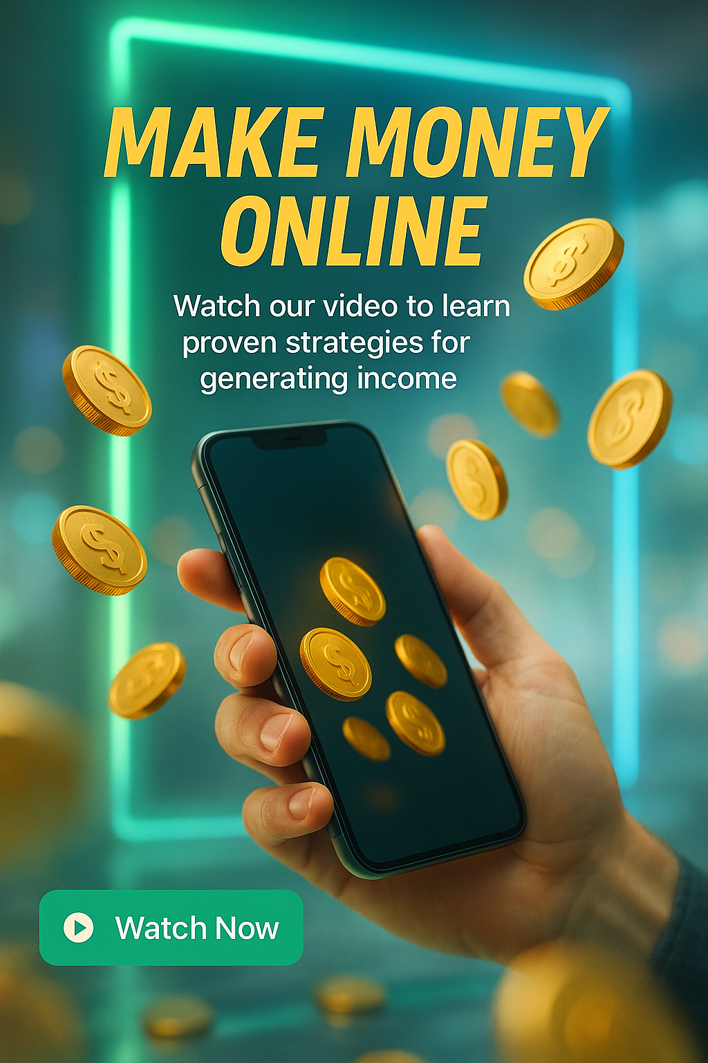 Vibrant promotional graphic showcasing a smartphone with floating coins, designed to attract viewers to a video about earning money online. Ideal for social media advertising.