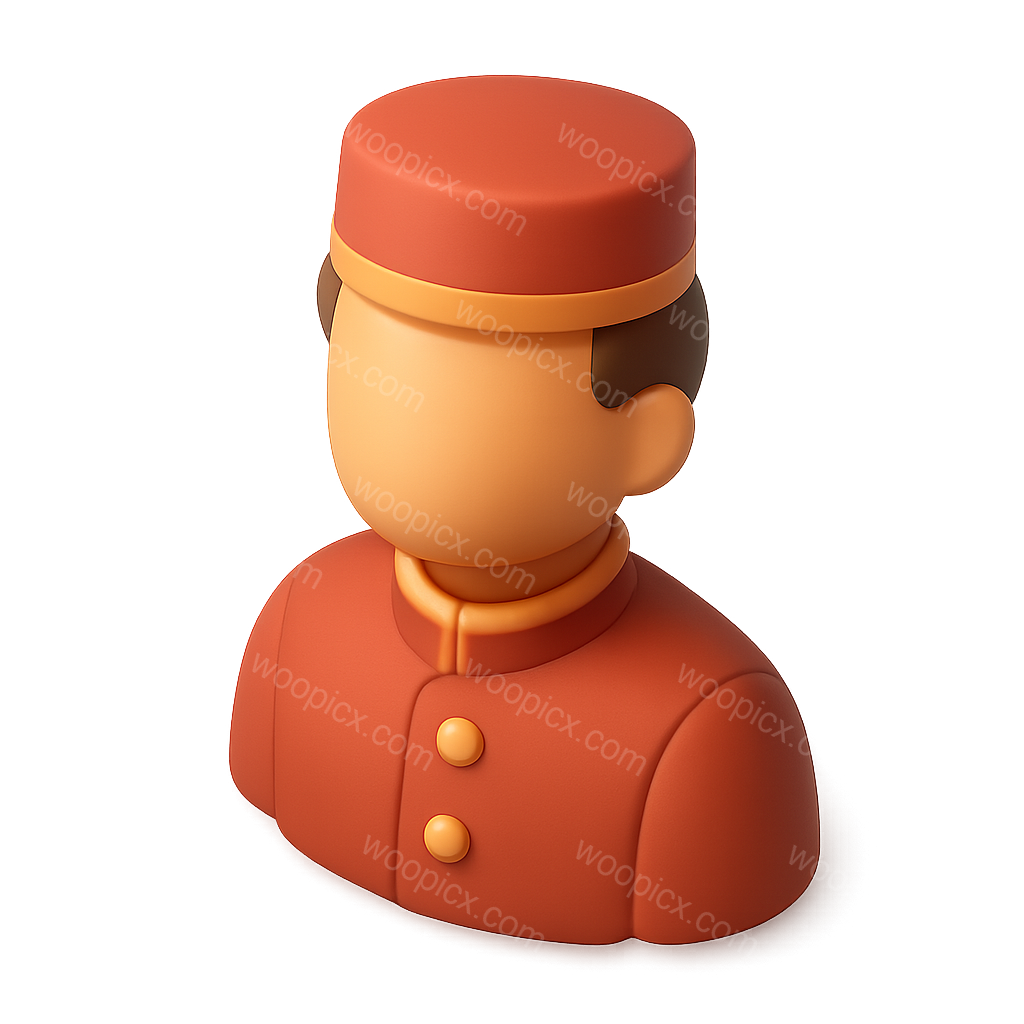 A stylized 3D bellhop icon depicted in a three-quarter view, featuring a rounded head and a vibrant red uniform. The design is simple yet volumetric, set against a soft gradient background.