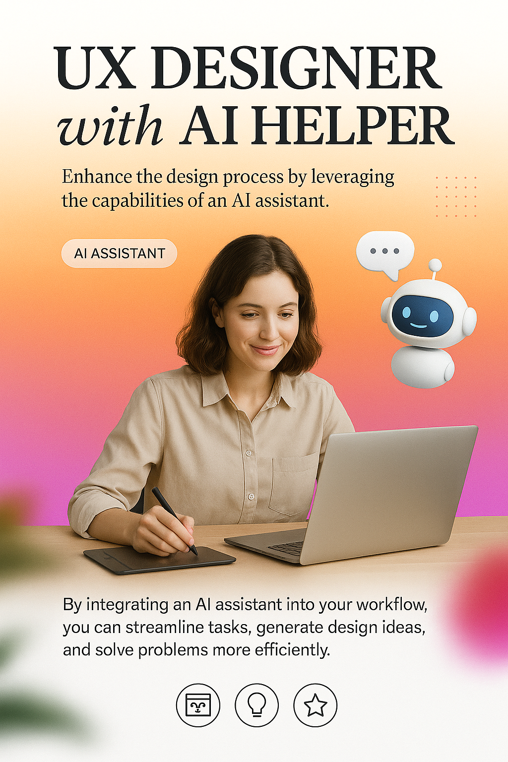 /Collection: /by davooda/Type: PNG/A UX designer works with an AI assistant, showcasing a modern workspace. The image features a gradient background, highlighting the collaboration between human creativity and AI technology.