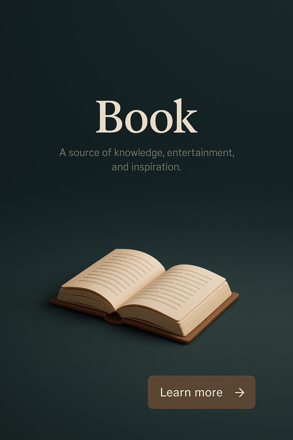 A realistic 3D scene showcasing an open book on a dark gradient background. The book is detailed, with visible pages and a wooden base, inviting readers to explore its content.
