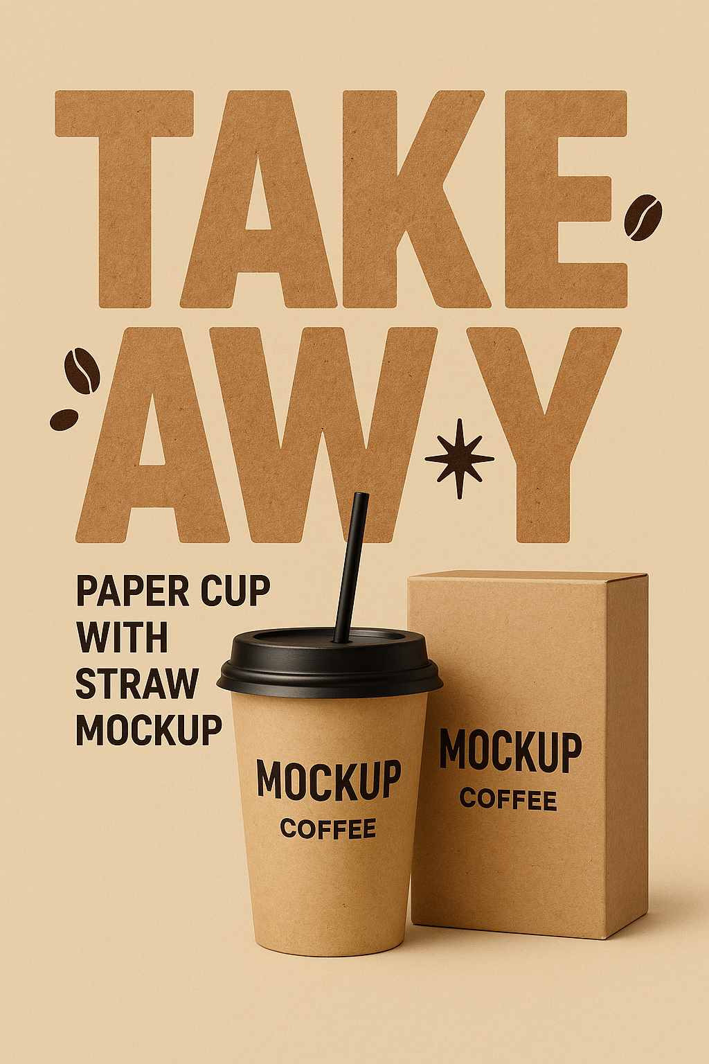 Stylish mockup showcasing a paper coffee cup with a straw and a matching box on a warm beige background, ideal for branding and promotional materials.