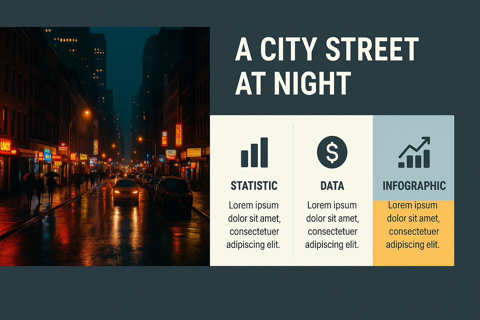 /Collection: /by davooda/Type: PNG/A visually striking infographic depicting a city street at night, featuring key statistics and data points. The design combines urban imagery with clear graphical elements, ideal for informative presentations.