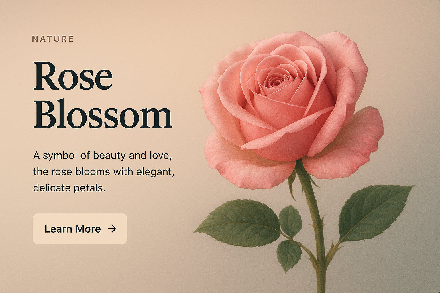 /Collection: /by davooda/Type: PNG/A beautifully illustrated rose blossom, showcasing its delicate petals against a soft gradient background. Accompanied by a text block and action button, it emphasizes elegance and beauty.