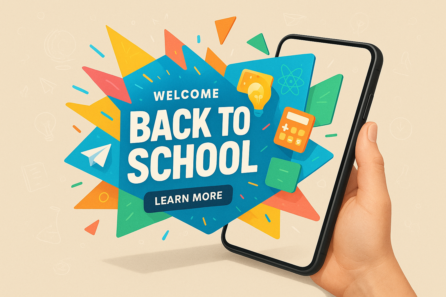 /Collection: /by davooda/Type: PNG/A colorful back-to-school advertisement featuring geometric shapes and symbols emerging from a smartphone. The design showcases playful typography and a balanced layout.