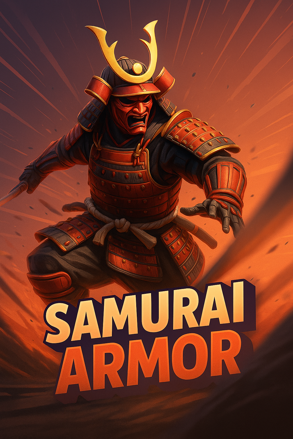 /Collection: /by davooda/Type: PNG/A vibrant illustration of samurai armor, showcasing dynamic lines and energetic colors. The bold title 'SAMURAI ARMOR' stands out prominently against a smooth gradient background.