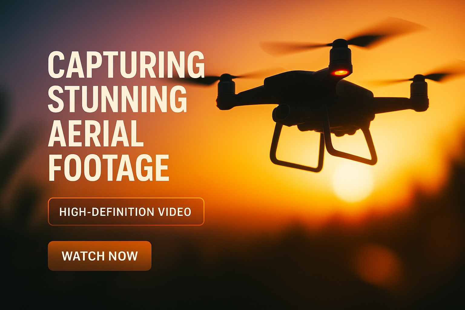 This is a promotional graphic featuring a drone against a sunset backdrop, designed to attract viewers to high-definition aerial video content.
