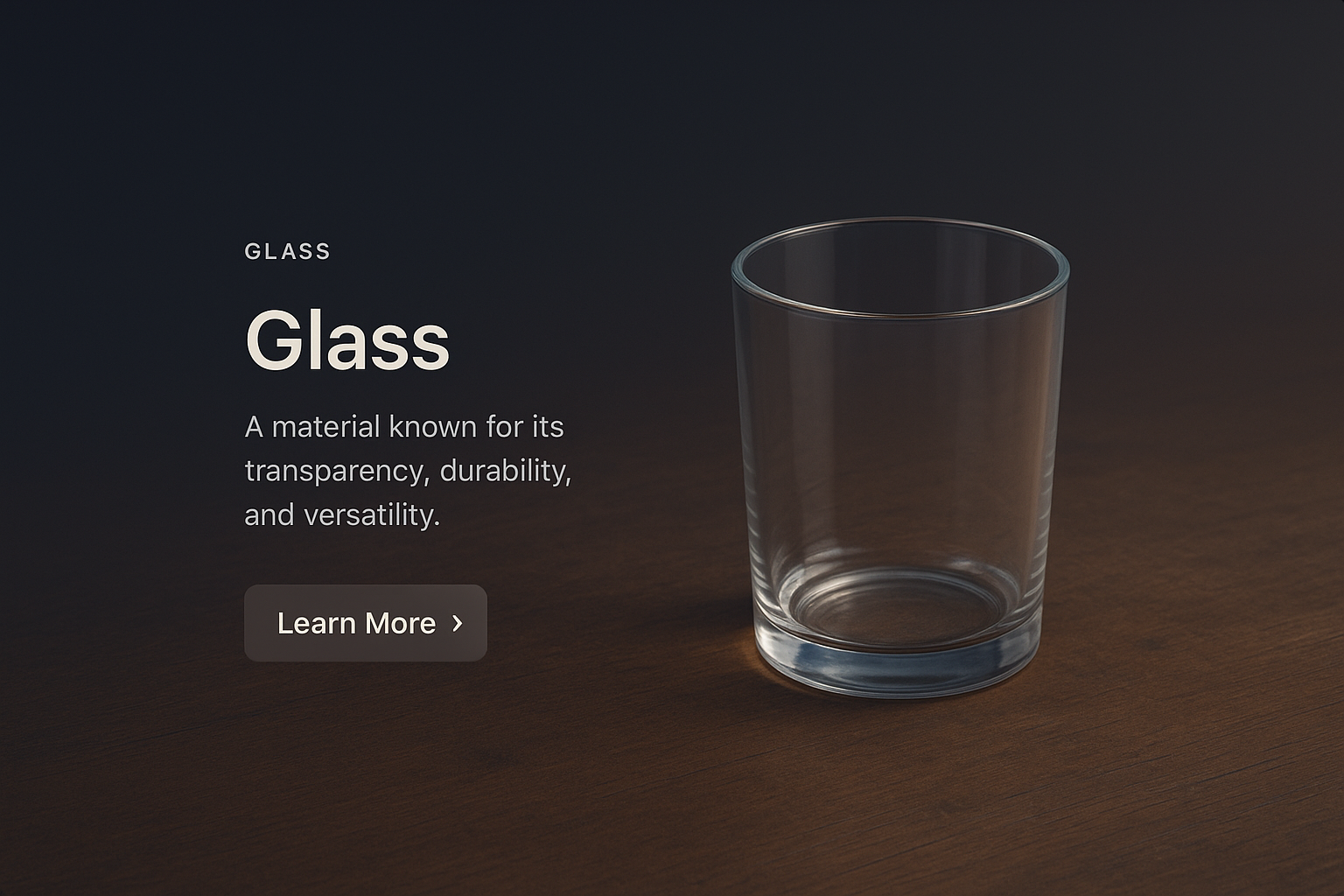 A sleek 3D representation of a glass object, showcasing its transparency and realism. The design includes a dark gradient background, text block, and a 'Learn More' button.