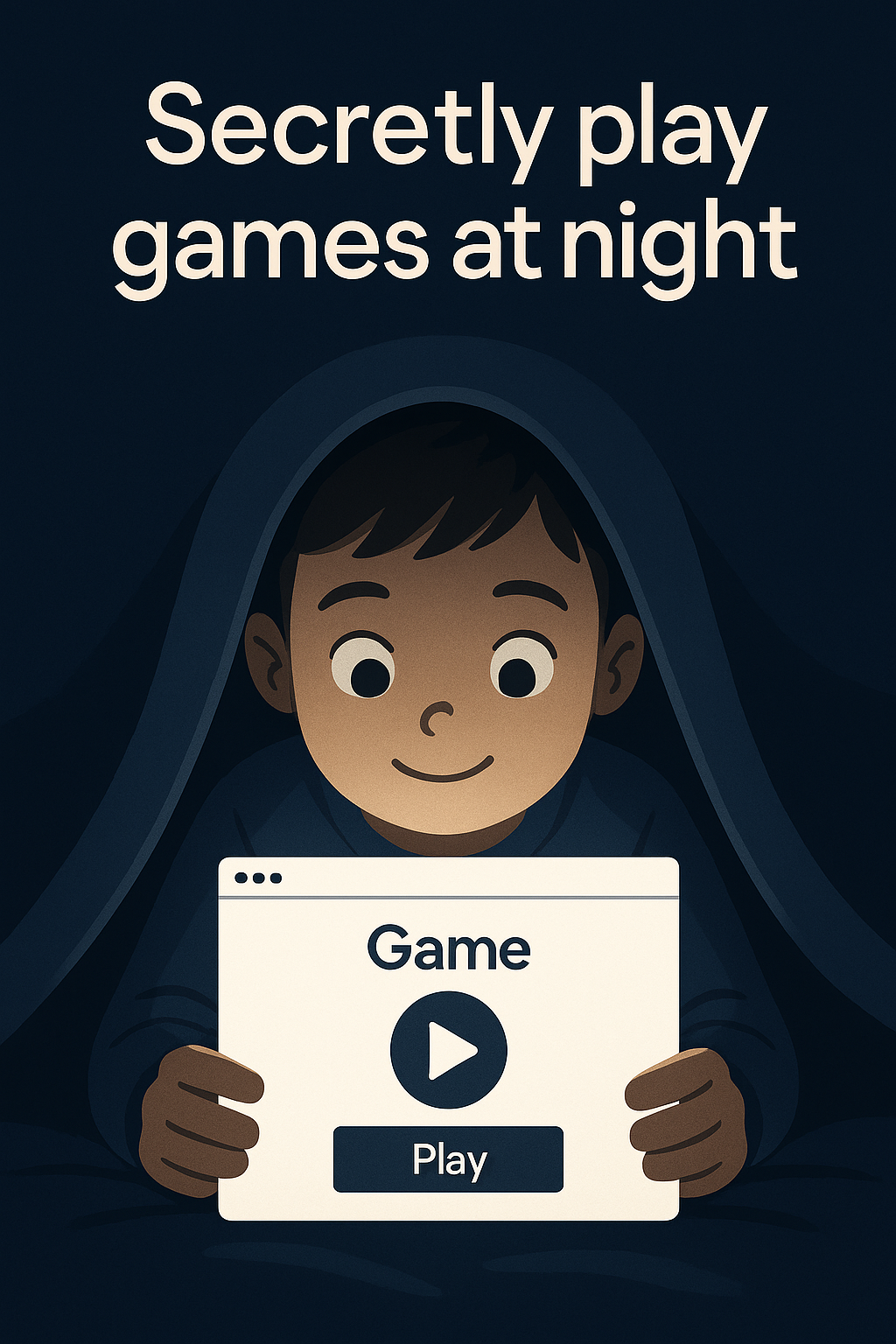 A playful illustration depicting a child gaming under a blanket at night, ideal for promoting gaming apps or children's entertainment.