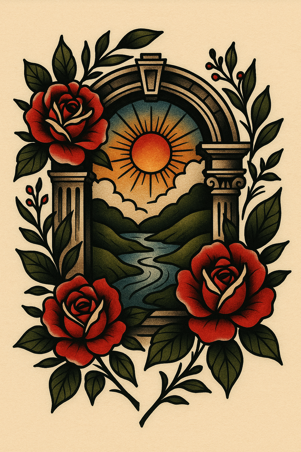 Vintage Tattoo Style Tunnel with Roses and Sun