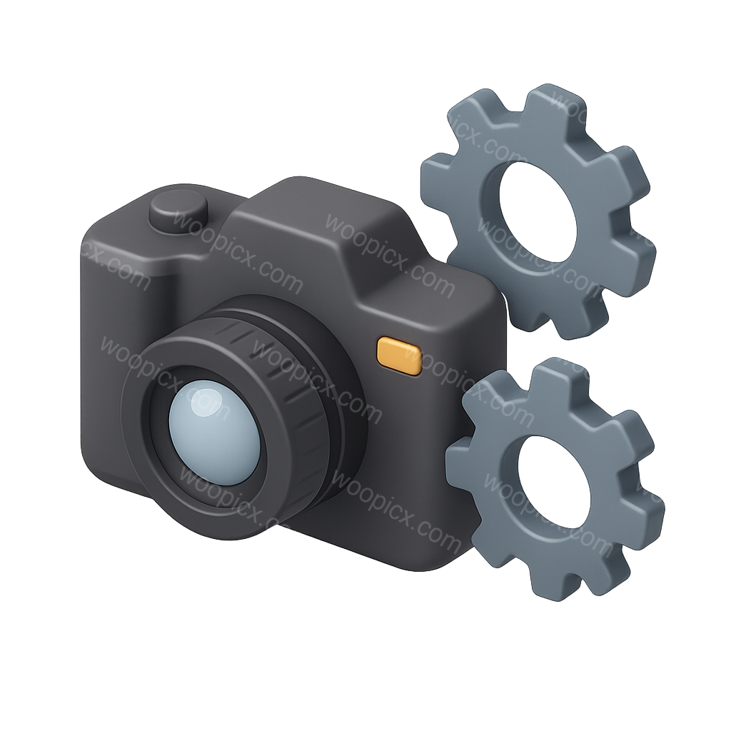 A stylized 3D camera icon featuring a lens and gears, representing settings adjustments. The design has a transparent background and a three-quarter isometric view, enhancing its volumetric appearance.
