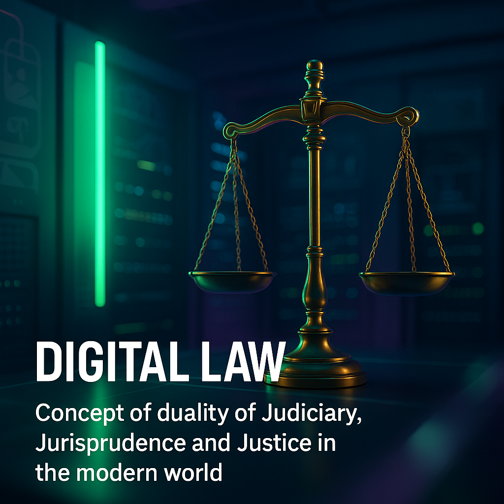 /Collection: /by davooda/Type: PNG/A modern graphic representation of digital law, featuring a balanced scale symbolizing justice, set in a sleek digital environment. Ideal for legal tech discussions.
