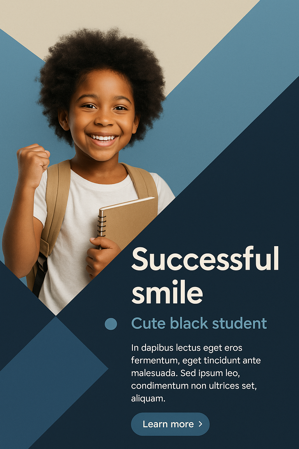 A cheerful black student with a big smile, holding a notebook against a geometric background. The design features a clear hierarchy and engaging color scheme.