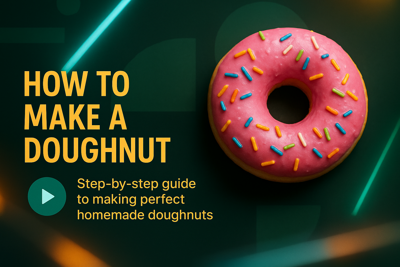 Vibrant image of a pink doughnut with sprinkles, accompanied by a tutorial theme, ideal for food blogs or recipe sharing on social media.