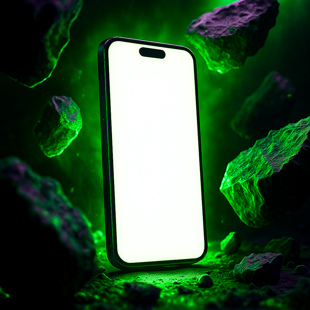 Visually striking smartphone mockup surrounded by glowing green rocks, perfect for technology branding or product showcases. The minimalist design highlights the device's screen.